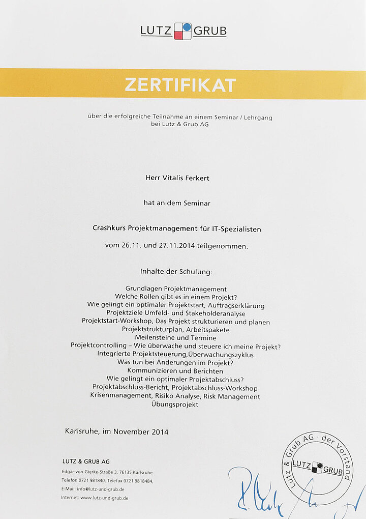 Projektmanagement ist eine Schlüsselkompetenz in vielen Branchen und Unternehmen. Ein Zertifikat in diesem Bereich zeigt potenziellen Arbeitgebern, dass Sie über fundierte Kenntnisse und Fähigkeiten verfügen, um komplexe Projekte erfolgreich zu planen, durchzuführen und abzuschließen. Es dient als Nachweis Ihrer Kompetenz und Engagement für professionelles Projektmanagement.